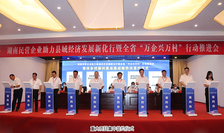 會上,進行了關于“幫扶千村 破零倍增”重點幫扶集體經(jīng)濟薄弱村專項行動和關于“民企興縣 跨越同行”助力鄉(xiāng)村振興重點幫扶縣專項行動文件的說明;公布了幫扶新化縣100個薄弱村的民營企業(yè)和商協(xié)會名單;簽訂了全省“萬企興萬村”行動示范項目9個、幫扶新化縣項目10個,涵蓋農(nóng)產(chǎn)品種植、鄉(xiāng)村旅游、美麗鄉(xiāng)村建設等方面,總投資超14億元。參與“民企興縣 跨越同行”行動的150個企業(yè)、商協(xié)會與全省15個鄉(xiāng)村振興重點幫扶縣簽訂了《幫扶鄉(xiāng)村振興重點縣戰(zhàn)略協(xié)議》。100個民營企業(yè)和商協(xié)會與100個幫扶新化縣薄弱村簽訂結對協(xié)議。會議還表揚了一批在“商會進新化 黨員聯(lián)鄉(xiāng)村”行動中的優(yōu)秀商協(xié)會黨組織。簽約儀式上,勞嘉總裁代表綠之韻集團與安化縣工商聯(lián)就鄉(xiāng)村振興建設工作簽訂了戰(zhàn)略協(xié)議。