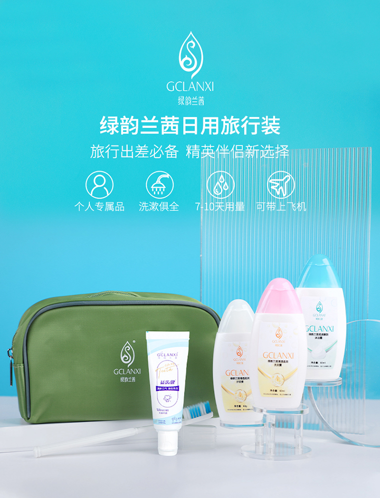 規(guī)格:60ml清透盈潤(rùn)洗發(fā)露、60ml清透盈潤(rùn)護(hù)發(fā)素、60ml柔潤(rùn)嫩膚沐浴露、 20g綠韻蘭茜益齒健牙膏、牙刷、便攜袋