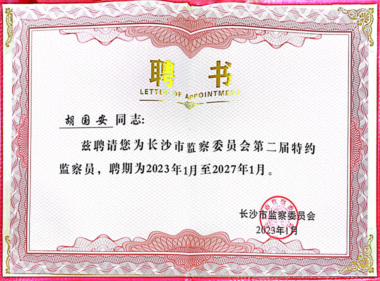 此次受聘為長沙市監(jiān)察委員會特約監(jiān)察員,胡國安董事長表示:特約監(jiān)察員既是一份榮譽,更是一項嚴肅的政治責任。我將積極發(fā)揮自身優(yōu)勢履行好監(jiān)督職責,以強烈的責任感和使命感,聚焦紀委監(jiān)委中心工作,對紀檢監(jiān)察機關(guān)和干部秉公執(zhí)紀執(zhí)法、嚴格謹慎用權(quán)等方面進行監(jiān)督,發(fā)揮好建言獻策、參謀咨詢、橋梁紐帶、宣傳引領(lǐng)作用,講政治、有奉獻、當表率,積極當好監(jiān)督員、參謀員和宣傳員,為推進全市紀檢監(jiān)察工作高質(zhì)量發(fā)展作出積極貢獻。