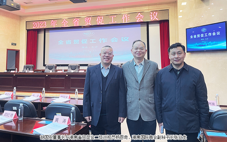 2023年2月17日,全省貿(mào)促工作會(huì)議在長沙召開。會(huì)議深入貫徹黨的二十大精神和習(xí)近平總書記對湖南重要講話重要指示批示精神,全面落實(shí)全國貿(mào)促工作會(huì)議、省委經(jīng)濟(jì)工作會(huì)議精神,總結(jié)2022年全省貿(mào)促工作,分析研判當(dāng)前形勢,安排部署2023年工作。湖南省貿(mào)促會(huì)黨組書記、會(huì)長楊愛云作工作報(bào)告。黨組副書記、副會(huì)長吳曙光主持會(huì)議。伍登國、傅丹舟、鄧羅興、胡強(qiáng)等會(huì)領(lǐng)導(dǎo)出席會(huì)議。省紀(jì)委監(jiān)委駐省商務(wù)廳紀(jì)檢組副組長周國強(qiáng)出席會(huì)議。中國國際商會(huì)湖南商會(huì)副會(huì)長、湖南省慈善總會(huì)副會(huì)長、綠之韻集團(tuán)董事長胡國安受邀參加會(huì)議。