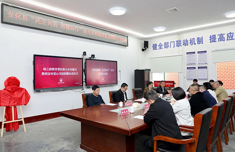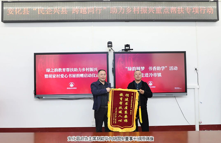 鄉(xiāng)村振興,教育先行。綠之韻集團董事長胡國安表示,助力鄉(xiāng)村振興重點縣專項行動是落實中央、省委鄉(xiāng)村振興戰(zhàn)略的重要舉措,我們民營企業(yè)家更要增強家國情懷,促進共同富裕的責任感和使命感。作為一名從安化大山里走出的企業(yè)家,積極投身到建設(shè)家鄉(xiāng)的事業(yè)中去,是我與生俱來的責任與使命。一直以來,綠之韻集團始終堅持把公益事業(yè)上升到企業(yè)發(fā)展戰(zhàn)略高度,積極探索新時代公益新模式,從關(guān)注個體,提升為關(guān)注社會發(fā)展、融入國家戰(zhàn)略。教育幫扶一直是綠之韻公益基金會的重要關(guān)注點之一。近年來,綠之韻在全國各地先后援建了11所希望學(xué)校,陸續(xù)投入1000萬元開展“樹人行動”,投入300萬元在全國各地開展“綠韻圓夢?書香助學(xué)”活動,投入1000萬元用于女性關(guān)愛活動,從“萬企幫萬村”到“萬企興萬村”,綠之韻集團支援安化的足跡遍布安化高明鄉(xiāng)、古樓鄉(xiāng)、冷市鎮(zhèn)、江南鎮(zhèn)、煙溪鎮(zhèn)等地,項目涉及賑災(zāi)濟困、興教助學(xué)、孤殘救助、醫(yī)療衛(wèi)生、修路飲水、養(yǎng)老醫(yī)療、中藥材種植加工等,累計向安化縣捐贈款物近600萬元,參與各類社會公益事業(yè)累計捐贈款物7600多萬元。同時,綠之韻一直把創(chuàng)建“學(xué)習(xí)型企業(yè)”作為企業(yè)戰(zhàn)略性發(fā)展的著力點。今天綠之韻在安化冷市鎮(zhèn)開展書香助學(xué)行動,既是響應(yīng)湖南省“民企興縣 跨越同行”助力鄉(xiāng)村振興重點幫扶縣專項行動,也希望書屋建設(shè)能夠進一步豐富村民的業(yè)余生活,引導(dǎo)村民及學(xué)生共建學(xué)習(xí)型群體,形成愛讀書、讀好書的學(xué)習(xí)習(xí)慣,助力鄉(xiāng)村文化振興。這所愛心書屋在落成后,會定期開設(shè)主題研學(xué)活動。后續(xù)還將在安化大橋?qū)W校設(shè)立專項獎學(xué)金,為家鄉(xiāng)的鄉(xiāng)村振興建設(shè)工作儲備更多優(yōu)質(zhì)人才。他希望,胡家村愛心書屋可以提升家鄉(xiāng)人民的生活幸福感、獲得感。同時,也能為孩子們點亮一盞燈、打開一扇門,在縣城里也能看到外面的世界和遠方。未來,他將繼續(xù)帶領(lǐng)綠之韻集團積極參與安化鄉(xiāng)村振興建設(shè),并通過書香助學(xué)行動影響和帶動更多的愛心人士和企業(yè)加入到建設(shè)家鄉(xiāng)的行列,為安化美麗鄉(xiāng)村的建設(shè)貢獻出自己的一份力量。