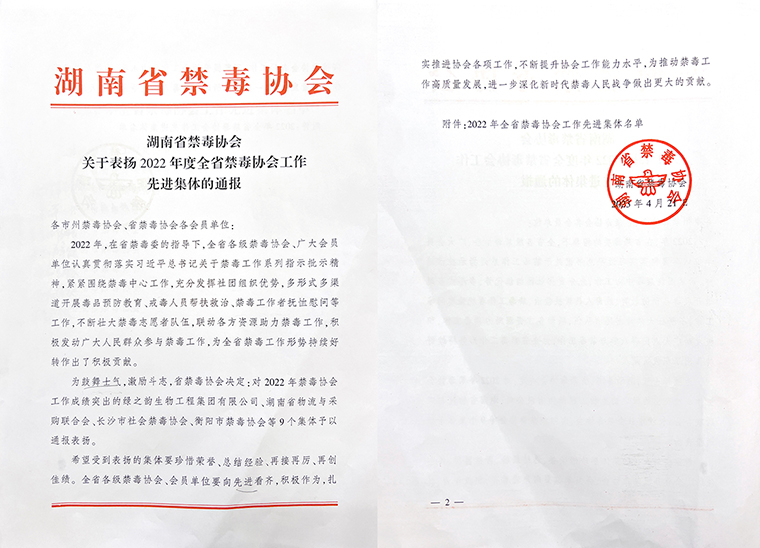 會議伊始,湖南省禁毒協(xié)會秘書長盧敏作工作報告,報告全面總結(jié)了2022年度全省禁毒協(xié)會工作。2022年,省禁毒協(xié)會整合社會資源,積極開展禁毒宣傳教育、吸毒人員戒治幫扶、走訪調(diào)研、撫恤慰問等工作,協(xié)會工作取得新成效。省禁毒協(xié)會獲評湖南省最美公益普法集體,湖南省禁毒全媒體中心獲評2022年度湖南省好網(wǎng)民項目, “我是答題王”湖南省禁毒知識競賽項目獲評2022年度湖南省最佳志愿服務(wù)項目, “青春手牽手”“健康無毒、青春無悔”禁毒宣傳項目攬獲第六屆中國青年志愿服務(wù)項目大賽金獎、銀獎。隨后,衡陽、常德市禁毒協(xié)會及優(yōu)秀禁毒講師代表在會上作經(jīng)驗發(fā)言,交流探討了各地禁毒工作的經(jīng)驗做法。會上湖南省禁毒協(xié)會決定對 2022 年禁毒協(xié)會工作成績突出的集體進(jìn)行表彰。湖南省禁毒協(xié)會常務(wù)理事、省公安廳禁毒總隊預(yù)防教育支隊支隊長、二級高級警長彭國清宣讀表揚(yáng)通報。綠之韻集團(tuán)被評為“2022年度湖南省禁毒協(xié)會工作先進(jìn)集體”。