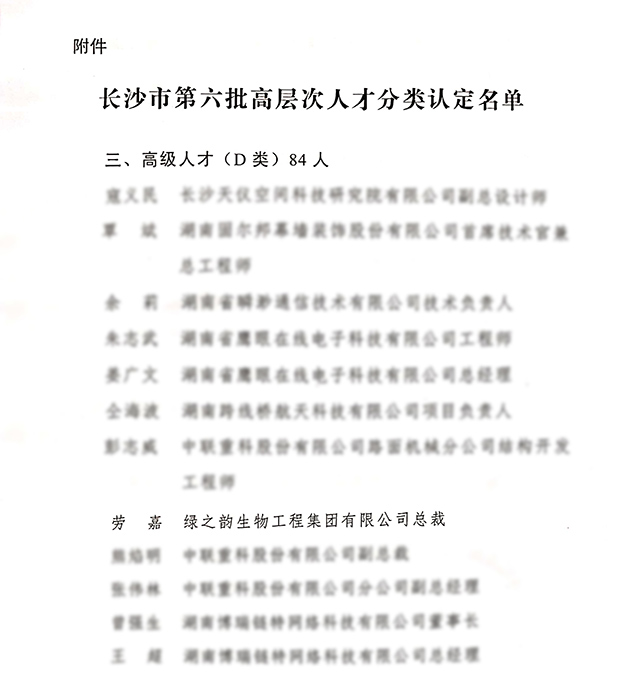 根據(jù)《長(zhǎng)沙市建設(shè)創(chuàng)新創(chuàng)業(yè)人才高地的若干措施》有關(guān)精神,按照中共長(zhǎng)沙市委人才工作領(lǐng)導(dǎo)小組《長(zhǎng)沙市高層次人才分類認(rèn)定實(shí)施辦法(試行)》、《2019年度長(zhǎng)沙市高層次人才分類認(rèn)定目錄》和《長(zhǎng)沙市移動(dòng)互聯(lián)網(wǎng)企業(yè)高層次人才分類認(rèn)定目錄》的有關(guān)要求,經(jīng)用人單位自主申報(bào)、各區(qū)縣(市)和園區(qū)初審、市委人才辦復(fù)審,報(bào)市委人才工作領(lǐng)導(dǎo)小組審定,確定了長(zhǎng)沙市第六批高層次人才分類認(rèn)定名單,綠之韻生物工程集團(tuán)有限公司(以下簡(jiǎn)稱“綠之韻”)董事、總裁勞嘉女士成功入選。