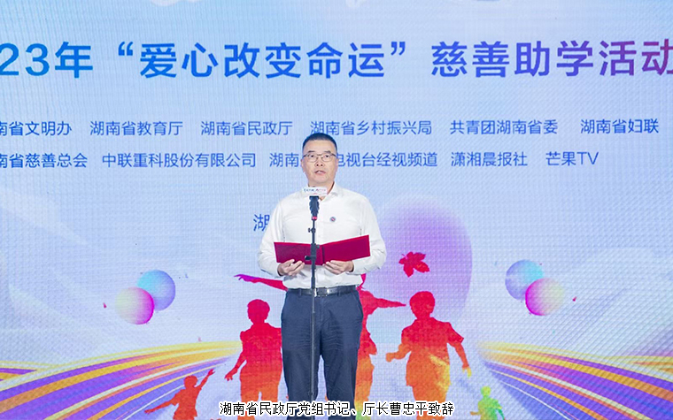 活動現(xiàn)場播放了“愛心改變命運(yùn)”2023年主題視頻以及湖南14個市州慈善會助學(xué)成果視頻。湖南省民政廳黨組書記、廳長曹忠平致辭。他在致辭中指出,慈善事業(yè)是一項(xiàng)獻(xiàn)愛心、暖人心、惠民生的崇高事業(yè)。人生之善莫過于助人,助人之德莫過于助學(xué),慈善助學(xué)是改變困境學(xué)子的希望霞光。他呼吁,社會各界攜起手來,共同加入“愛心改變命運(yùn)”慈善助學(xué)行動,用博大的愛心澆灌未來。
