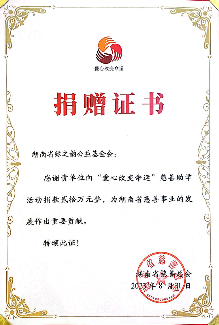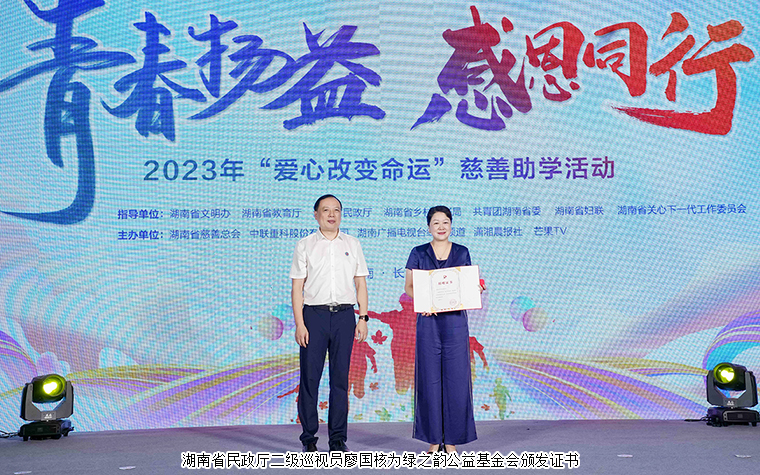 涓涓愛心匯流成河,點(diǎn)點(diǎn)星光照亮未來。愛心企業(yè)、愛心單位線上線下齊發(fā)力。今年7月,綠之韻公益基金會攜手湖南省慈善總會、芒果公益開啟“愛心改變命運(yùn)”助學(xué)季,上線“2023愛心改變命運(yùn)”網(wǎng)絡(luò)籌款募捐項(xiàng)目,向社會籌措助學(xué)資金,資助湖南省內(nèi)勵志學(xué)子圓夢大學(xué)。此次活動現(xiàn)場,勞嘉理事長代表綠之韻公益基金會向“愛心改變命運(yùn)”項(xiàng)目捐資20萬,為圓勵志學(xué)子大學(xué)夢貢獻(xiàn)一份力量。