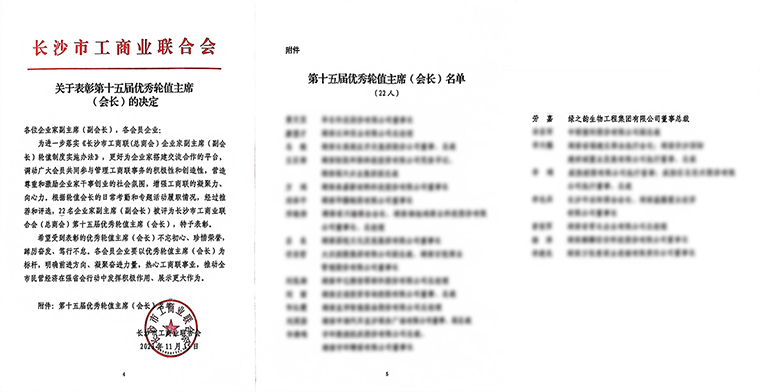 會議集中表彰了一批優(yōu)秀個人、企業(yè)和商會。胡國安董事長作為湖南省長沙市光彩事業(yè)基金會理事長,帶領(lǐng)綠之韻集團在推動企業(yè)高質(zhì)量發(fā)展的同時,以高度的責(zé)任感和使命感,積極投身鄉(xiāng)村振興、愛心助學(xué)等公益事業(yè),在光彩事業(yè)工作中表現(xiàn)突出并做出重要貢獻,綠之韻集團被長沙市工商業(yè)聯(lián)合會(總商會)授予“光彩事業(yè)先進民營企業(yè)”稱號。根據(jù)輪值會長的日??记诤蛯n}活動履職情況,經(jīng)過推薦和評選,勞嘉總裁等22名企業(yè)家副主席(副會長)被評為長沙市工商業(yè)聯(lián)合會(總商會)第十五屆優(yōu)秀輪值主席(會長)。