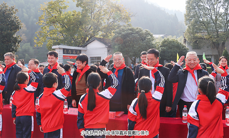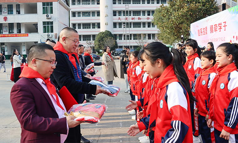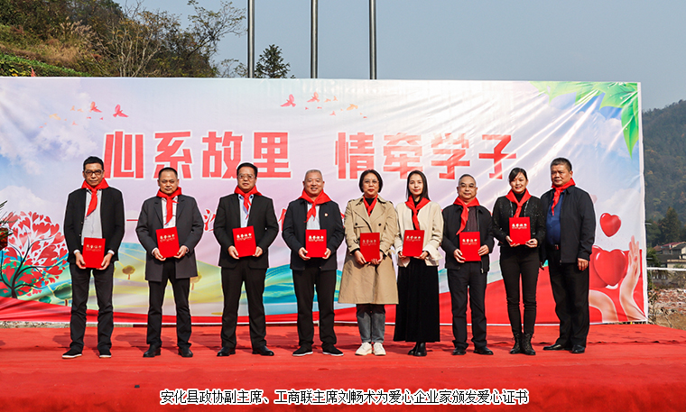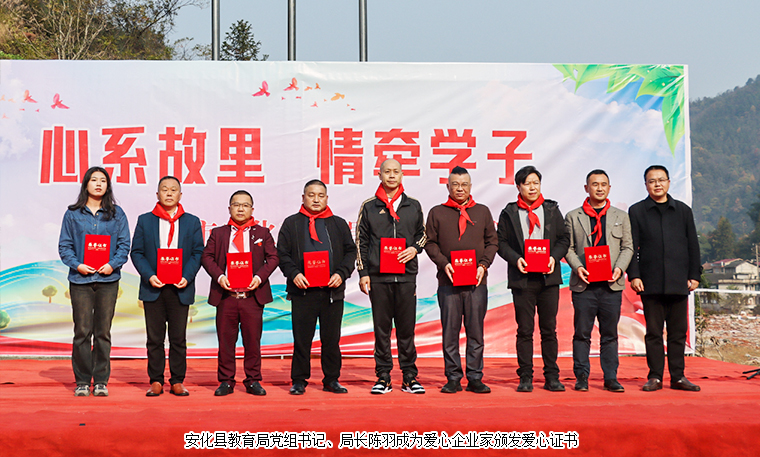 活動(dòng)伊始,少先隊(duì)員們?yōu)榈綀?chǎng)嘉賓佩戴紅領(lǐng)巾,行隊(duì)禮,用行動(dòng)向愛(ài)心企業(yè)和人士表達(dá)誠(chéng)摯的感謝。愛(ài)心捐贈(zèng)儀式上,馬路鎮(zhèn)中心學(xué)校黨支部書記、校長(zhǎng)黃攀峰在致辭中感謝了長(zhǎng)沙市安化商會(huì)以綠之韻為代表的諸多愛(ài)心企業(yè)與愛(ài)心志愿者們對(duì)學(xué)校及孩子們的關(guān)愛(ài)與幫助。隨后,長(zhǎng)沙市安化商會(huì)會(huì)長(zhǎng)、綠之韻集團(tuán)董事長(zhǎng)胡國(guó)安與長(zhǎng)沙市安化商會(huì)黨支部書記、執(zhí)行會(huì)長(zhǎng)吳余生向馬路鎮(zhèn)蒼場(chǎng)完小、東坪完小捐贈(zèng)50萬(wàn)元的現(xiàn)金支票。安化縣政協(xié)副主席、工商聯(lián)主席劉暢術(shù),安化縣教育局黨組書記、局長(zhǎng)陳羽成為愛(ài)心企業(yè)頒發(fā)捐贈(zèng)證書。