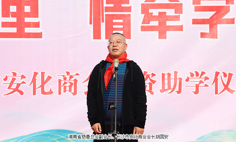 捐贈(zèng)儀式上,胡國(guó)安會(huì)長(zhǎng)講話。他首先向參加活動(dòng)的領(lǐng)導(dǎo)致以真摯的感謝,向辛勤耕耘在教育一線的學(xué)校各位領(lǐng)導(dǎo)和老師致以崇高的敬意,向家鄉(xiāng)的父老鄉(xiāng)親和同學(xué)們表示親切的問(wèn)候。建設(shè)家鄉(xiāng),回報(bào)桑梓是我們每一個(gè)安化人的夢(mèng)想。長(zhǎng)沙市安化商會(huì)積極作為,主動(dòng)承擔(dān)非公經(jīng)濟(jì)企業(yè)的社會(huì)責(zé)任,組織會(huì)員積極參加公益活動(dòng),累計(jì)捐贈(zèng)款物近900萬(wàn)元。作為從安化大山里走出的企業(yè)家,積極投身到建設(shè)家鄉(xiāng)的事業(yè)中去,是我們與生俱來(lái)的責(zé)任與使命。今天我們?cè)诎不R路鎮(zhèn)蒼場(chǎng)完小和東坪鎮(zhèn)完全小學(xué)捐贈(zèng)50萬(wàn)元愛(ài)心款項(xiàng),為改善學(xué)校教學(xué)環(huán)境和條件提供力所能及的幫助,給予那些品學(xué)兼優(yōu)的學(xué)生和辛苦耕耘的老師更多鼓勵(lì)和學(xué)習(xí)的機(jī)會(huì),希望營(yíng)造濃厚的關(guān)心教育和培養(yǎng)人才的濃厚氛圍。同時(shí),也希望學(xué)校的優(yōu)秀師生代表可以堅(jiān)定理想信念,樹立遠(yuǎn)大抱負(fù),把這份殷殷愛(ài)心轉(zhuǎn)化為成才之志、奮發(fā)之源,在建設(shè)家鄉(xiāng)、投身鄉(xiāng)村振興、回報(bào)社會(huì)的生動(dòng)實(shí)踐中放飛青春夢(mèng)想。希望每一個(gè)走出安化的人都可以不忘家鄉(xiāng)養(yǎng)育之恩,大力支持家鄉(xiāng)各項(xiàng)事業(yè)發(fā)展,為建設(shè)新時(shí)代高質(zhì)量、富饒美麗的安化貢獻(xiàn)一份力量。