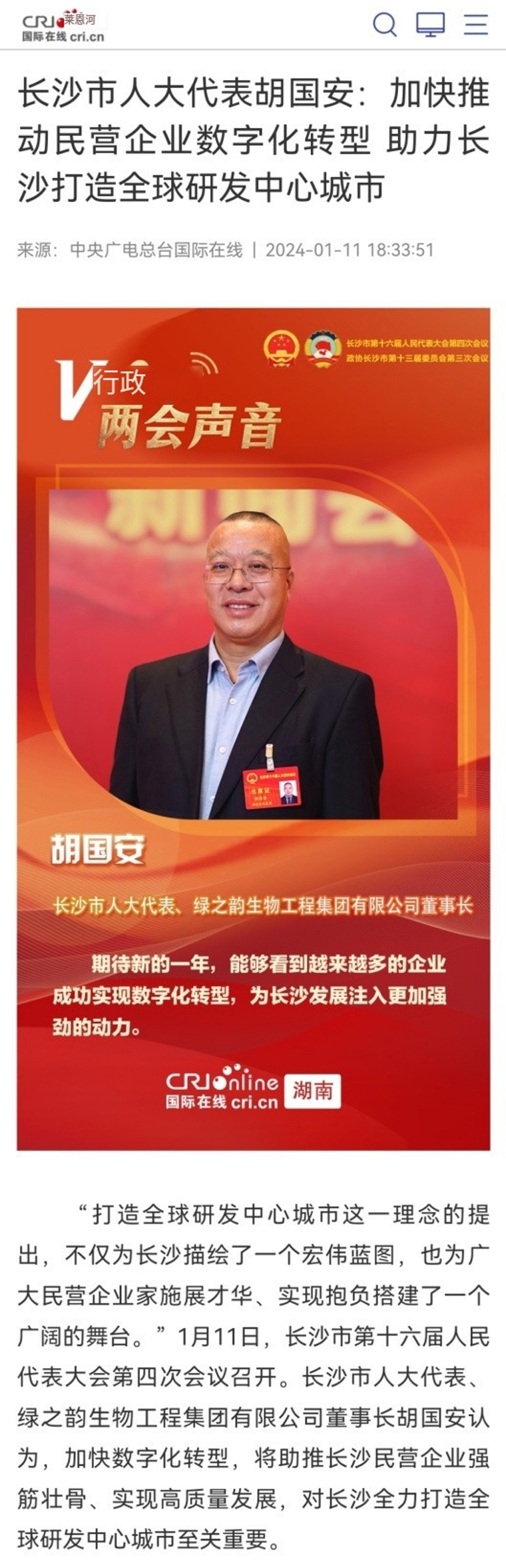 闊步新征程,建功新時(shí)代!2023年是全面貫徹黨的二十大精神的開局之年,也是三年新冠疫情防控轉(zhuǎn)段后經(jīng)濟(jì)恢復(fù)發(fā)展的一年。這一年以來,胡國安代表在市人大及其常委會(huì)領(lǐng)導(dǎo)下,積極參加長沙市人大“鄉(xiāng)村振興長沙行”、“長株潭交通一體化規(guī)劃與重點(diǎn)項(xiàng)目”、“聚焦強(qiáng)省會(huì)戰(zhàn)略,助推高質(zhì)量發(fā)展”、“平安建設(shè)”等重點(diǎn)項(xiàng)目調(diào)研和視察活動(dòng),踐行了“人民選我當(dāng)代表、我當(dāng)代表為人民”的莊嚴(yán)承諾。2024年是中華人民共和國成立75周年,是人民代表大會(huì)制度建立70周年,是實(shí)施 “十四五”規(guī)劃的關(guān)鍵一年,是長沙現(xiàn)代化征程戰(zhàn)略深入推進(jìn)的關(guān)鍵發(fā)展時(shí)期。作為在長沙這片沃土上成長起來的民營企業(yè),綠之韻將認(rèn)真貫徹落實(shí)今年長沙“兩會(huì)”精神指示,準(zhǔn)確把握所處發(fā)展階段,奮力擔(dān)當(dāng)歷史使命,穩(wěn)住向上向好發(fā)展態(tài)勢(shì),全領(lǐng)域、全方位、全過程貫徹高質(zhì)量的發(fā)展要求,深入推進(jìn)“大品牌+大健康+大金融”的發(fā)展戰(zhàn)略,聚焦實(shí)業(yè),做精主業(yè),更加注重發(fā)展方式綠色轉(zhuǎn)型,更加注重激發(fā)干事創(chuàng)業(yè)活力,積極承擔(dān)企業(yè)公民責(zé)任,把企業(yè)發(fā)展腳步與鄉(xiāng)村振興工作進(jìn)行有效銜接,緊緊圍繞全面落實(shí)“三高四新”戰(zhàn)略定位和使命任務(wù),創(chuàng)新實(shí)干,勇毅前行,為建設(shè)現(xiàn)代化新長沙作出更大的貢獻(xiàn)!