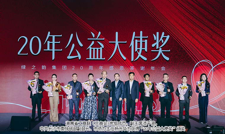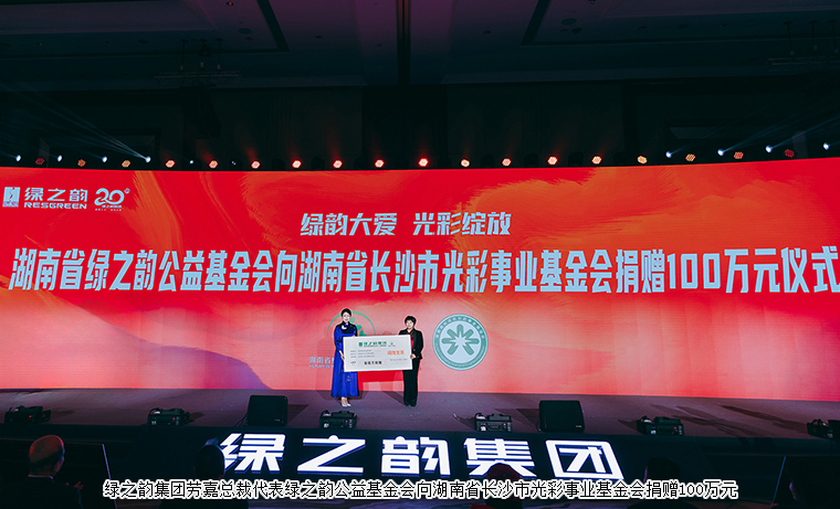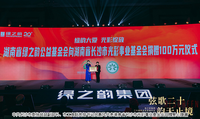 馭時而進,廿載逐光;回溯往昔,心懷感恩;繼往開來,至臻致遠。創(chuàng)立20年來,綠之韻積極承擔企業(yè)公民責(zé)任,熱心公益事業(yè)。公益路上,綠之韻的事業(yè)伙伴中也涌現(xiàn)出眾多的向善向上的力量,瑞僖金融、綠之韻三十九鋪、云來科技、綠之韻低碳、綠之韻碧波庭、綠之韻數(shù)字化健康科技、綠之韻幸福國際、綠之韻微看等憑借積極投身公益獲得綠之韻“20年公益大使獎”。湖南省工商聯(lián)(總商會)黨組成員、副主席漆平波,中共長沙市委統(tǒng)戰(zhàn)部副部長、市僑辦主任楊光華上臺為獲得者頒獎。晚會現(xiàn)場,勞嘉理事長代表綠之韻公益基金會向湖南省長沙市光彩事業(yè)基金會捐贈100萬元愛心支票,中共長沙市委統(tǒng)戰(zhàn)部副部長、市工商聯(lián)黨組書記何惠風(fēng)向綠之韻公益基金會回贈愛心牌匾。該筆愛心善款將用于鄉(xiāng)村振興、幫扶濟困等光彩事業(yè),為需要幫助的人送去溫暖和希望。