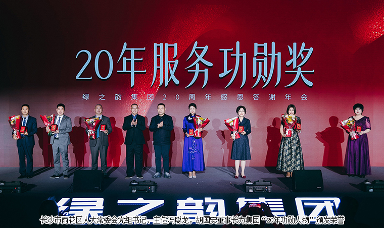 在集團二十年的發(fā)展歷程中,有這樣一群人,他們與綠之韻同成長,共發(fā)展,始終保持著創(chuàng)業(yè)激情、創(chuàng)新的精神,他們深諳企業(yè)經(jīng)營之道,是推動綠之韻業(yè)績增長的主力軍,是踐行商業(yè)模式創(chuàng)新的先驅(qū)者,是打造高效團隊的實踐者。綠之韻集團董事長胡國安、長沙市雨花區(qū)人大常委會黨組書記、主任馮聰龍上臺為集團“20年功勛人物”頒發(fā)榮譽。