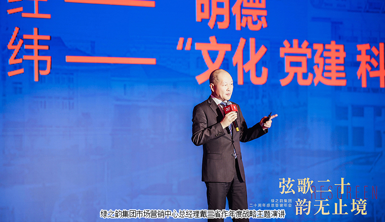 會上,綠之韻集團市場營銷中心總經(jīng)理戴三省作戰(zhàn)略主題演講。他以“三個不改變”為指導(dǎo)思想,以綠之韻集團第四個五年規(guī)劃為依據(jù),向與會嘉賓描繪了一幅由明德、親民、至善三條“經(jīng)線”與文化、黨建、科研、產(chǎn)品、服務(wù)、升級、公益、稅收、就業(yè)為九條“緯線”交織而成的宏偉畫面,深入淺出地向大家展示了綠之韻集團“三經(jīng)九緯”的戰(zhàn)略布局。