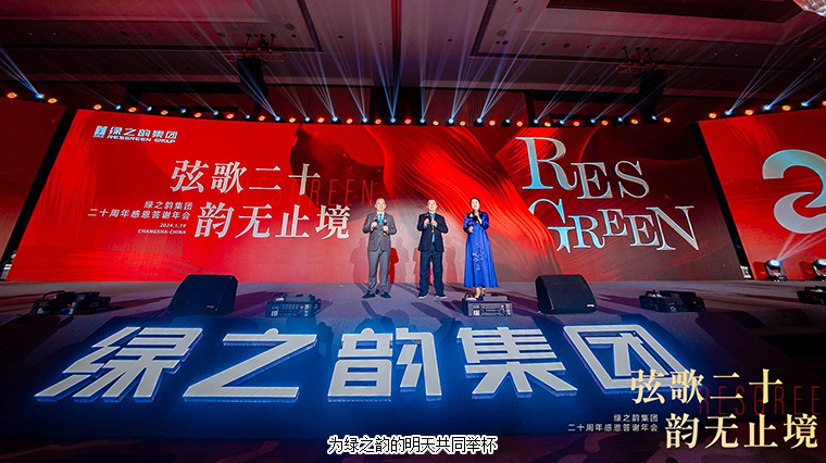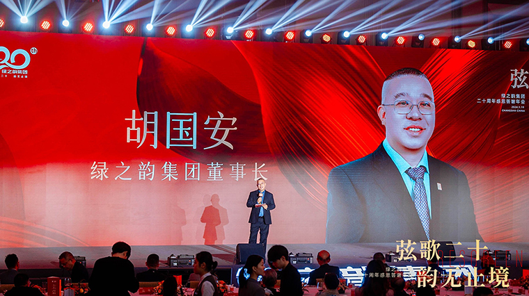 在全場最為熱烈的掌聲中,胡國安董事長講話。感謝大家能夠來到綠之韻集團20周年感恩答謝年會現(xiàn)場,共同分享喜悅、見證美好。感謝國家和這個時代,祖國的改革開放,世界的交流融合,科技的日新月異,是綠之韻可以獲得長足發(fā)展的根本原因。感謝綠之韻的員工和事業(yè)伙伴,從事業(yè)初創(chuàng)到穩(wěn)健發(fā)展,是一路走來的堅守和共同成長,才有綠之韻現(xiàn)在的模樣。感謝父母,他們擁有著善良、樸實、誠懇、大方、仁義、謙卑、互助等中華民族精神美德,我從我父母身上得以傳承,并在日后的事業(yè)中不斷轉(zhuǎn)化為我前行的動力。企業(yè)小的時候是自己的,做到一定大的時候就是國家的、是社會的。二十年來,綠之韻積極承擔企業(yè)公民責(zé)任,捐建11所希望學(xué)校,踴躍參與了100多項社會公益項目,累計捐款捐物達8400多萬元。剛剛,我參加了湖南省政府“迎新春送溫暖”活動,捐贈100萬元慰問困難群眾。今天在綠之韻集團二十周年慶典的現(xiàn)場,我們將再次向湖南省長沙市光彩事業(yè)基金會捐贈100萬元,用于鄉(xiāng)村振興、幫扶濟困等光彩事業(yè)。二十及冠,大道其行。下一個20年,綠之韻將堅持與祖國同行,與時代同行,持正念,行正道,得正果。在綠之韻二十周年之際,我們也有幸請到了中國著名詞曲家、音樂人、中國音樂家協(xié)會副主席何沐陽先生特別創(chuàng)作了20周年紀念曲《愿世間所有的美好如約而至》。最后,借用這首旋律優(yōu)美、意境深遠的歌曲,祝愿我們綠之韻20周年生日快樂,祝?,F(xiàn)場的各位領(lǐng)導(dǎo)嘉賓、全體綠之韻人所有的美好如約而至、身體健康、闔家歡樂、龍年大吉!