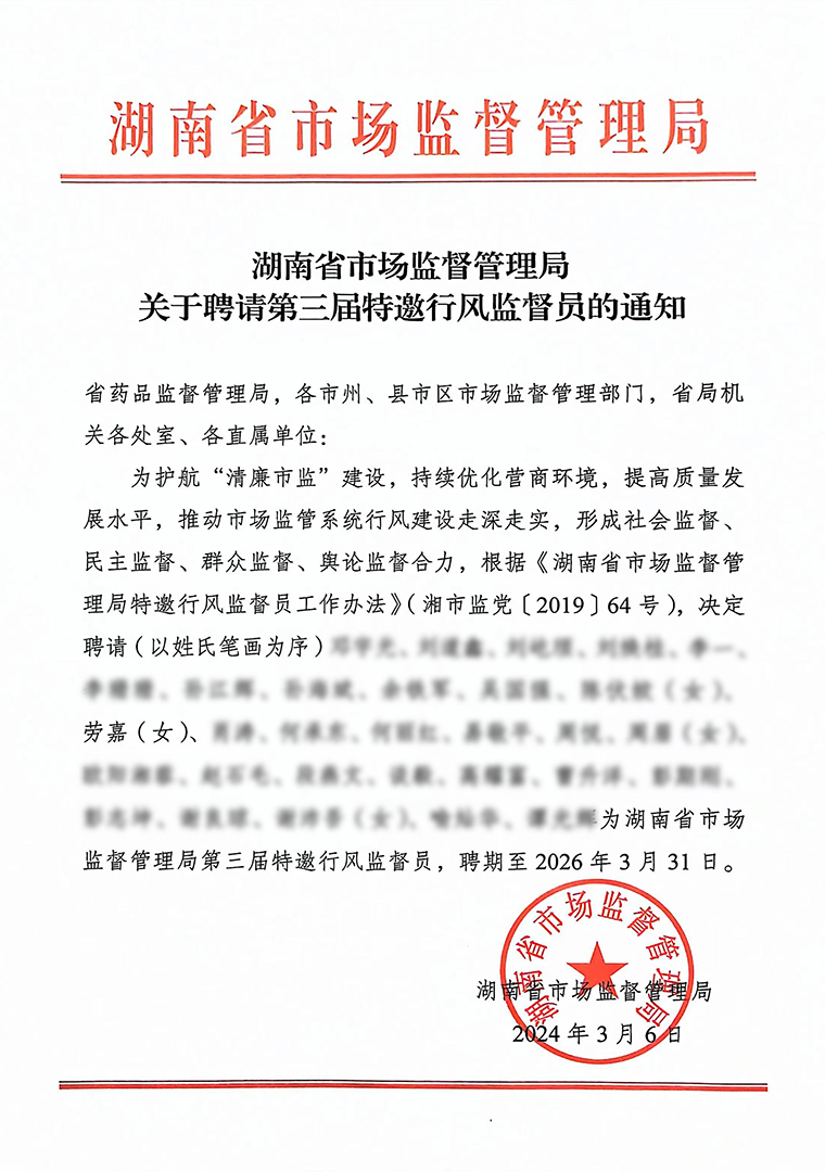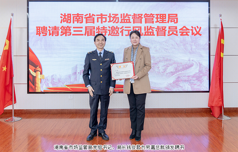 勞嘉總裁受聘為湖南省市場監(jiān)督管理局第三屆特邀行風(fēng)監(jiān)督員