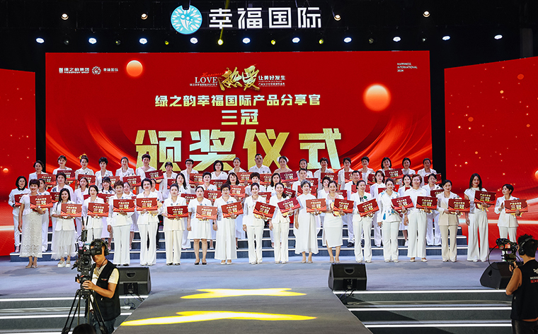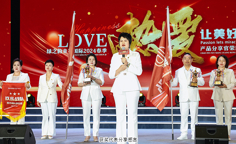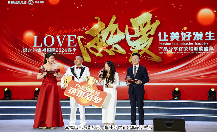 在活動(dòng)接近尾聲之時(shí),綠之韻集團(tuán)副總裁、幸福導(dǎo)師夏運(yùn)良上臺(tái)講話。他向大會(huì)現(xiàn)場(chǎng)以及通過直播互動(dòng)視頻觀看本次大會(huì)盛況的綠之韻幸福國際家人們致以熱烈的歡迎和誠摯的問候,并向每一位獲獎(jiǎng)?wù)弑硎緹崃业淖YR。他表示,今天大會(huì)的主題是熱愛,讓美好發(fā)生。今天站在舞臺(tái)的將近900位產(chǎn)品分享官、每一位戰(zhàn)隊(duì)長(zhǎng)和戰(zhàn)隊(duì)代表、所有分享者,以及全新亮相的五大市場(chǎng)的核心管理團(tuán)隊(duì)已經(jīng)很好地詮釋了這個(gè)主題,在2024年第一季度的戰(zhàn)斗中,你們用熱愛創(chuàng)造了一個(gè)美好的奇跡。什么是熱愛?一個(gè)真正熱愛事業(yè)的人,他們會(huì)有強(qiáng)大的內(nèi)在動(dòng)力;會(huì)有超強(qiáng)的抗壓能力;他們有著高效的時(shí)間管理和效率;他們善于創(chuàng)造勇于承擔(dān);他們自身有滿滿的成就感和幸福感。熱愛是綠之韻幸福國際能一直走上坡路的燈塔。從綠之韻幸福國際成立那一天起,科技讓中醫(yī)養(yǎng)生進(jìn)萬家,就是我們奮斗的燈塔。因?yàn)闊釔?,我們傳承和?chuàng)新老祖宗的中醫(yī)智慧,做一款讓世界更美好的產(chǎn)品,幫助更多人收獲健康;因?yàn)闊釔?,我們讓幸福國際成為一個(gè)長(zhǎng)久、安全、穩(wěn)健的創(chuàng)業(yè)平臺(tái),讓幸福代言人能夠擁有低門檻就業(yè)、創(chuàng)業(yè)的機(jī)會(huì);因?yàn)闊釔?,我們?huì)努力,成為一群靠譜的人,讓美好在對(duì)的時(shí)間都能如約而至。感謝每一位熱愛著產(chǎn)品、熱愛著綠之韻幸福國際的你們,我會(huì)竭盡全力,為你們的熱愛保駕護(hù)航!