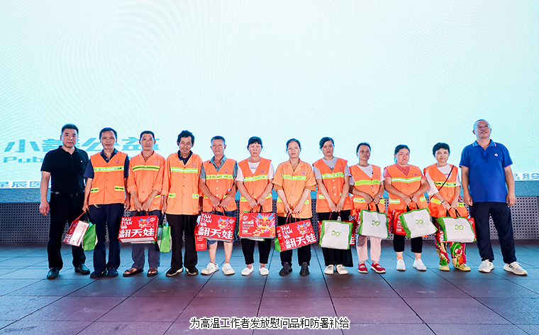 活動現(xiàn)場為高溫工作者代表發(fā)放了慰問品和防暑補(bǔ)給,長沙市慈善事務(wù)中心副主任、長沙市慈善總會副秘書長陳飛宇,長沙市福利彩票發(fā)行中心副主任崔玲為快遞小哥、外賣騎手發(fā)放防暑補(bǔ)給;長沙市民政局慈善事業(yè)促進(jìn)處副處長董又紅,長沙市慈善事務(wù)中心主任、長沙市慈善總會秘書長周勝規(guī)為交通警察、城管隊員代表發(fā)放防暑補(bǔ)給;長沙市廣播電視臺新聞中心副主任、政法頻道、新聞綜合頻道副總監(jiān)李越強(qiáng),長沙市人大代表、湖南省慈善總會副會長、綠之韻集團(tuán)董事長胡國安為環(huán)衛(wèi)工人發(fā)放防暑補(bǔ)給。