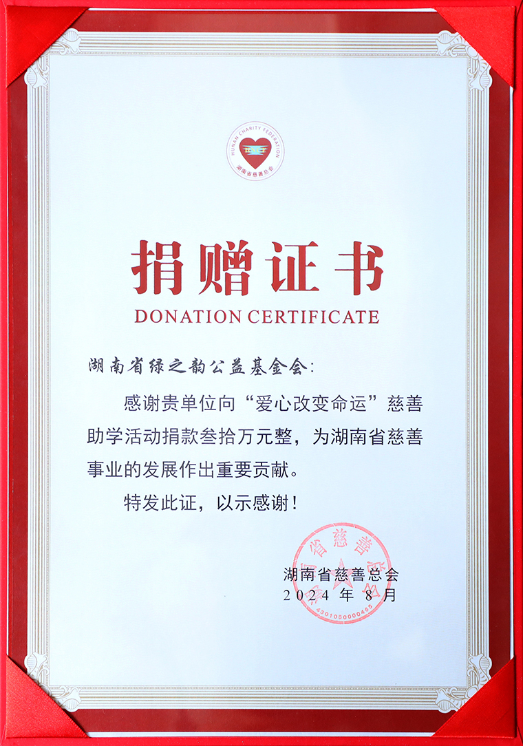 金秋結(jié)碩果,愛心筑夢成。愛心企業(yè)、愛心單位線上線下齊發(fā)力。今年8月,綠之韻公益基金會攜手湖南省慈善總會、芒果公益開啟“愛心改變命運”助學季,上線“2024愛心改變命運”網(wǎng)絡籌款募捐項目,向社會籌措助學資金,資助湖南省內(nèi)勵志學子圓夢大學。此次活動現(xiàn)場,勞嘉總裁代表綠之韻集團向“愛心改變命運”項目捐資30萬,為圓勵志學子大學夢貢獻一份力量。
