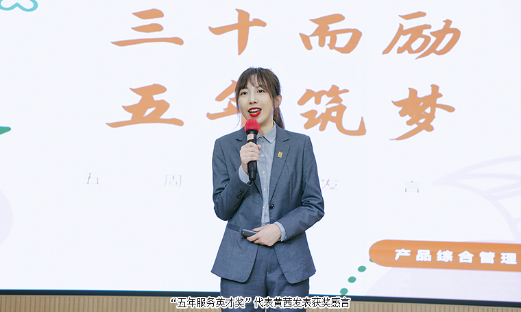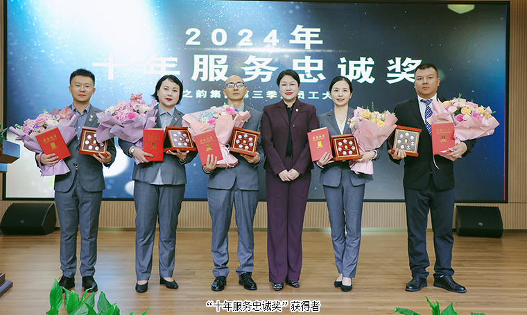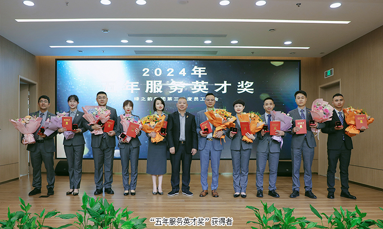 為表彰先進、樹立榜樣、激勵奮進,大會對2024年度“五年服務英才獎”、“十年服務忠誠獎”、“二十年服務功勛獎”進行了表彰,鼓勵全體員工以優(yōu)秀為標桿,勇于追求卓越,在工作中實現(xiàn)個人價值與奮斗目標。勞嘉總裁、胡均安常務副總裁依次為獲獎優(yōu)秀個人頒發(fā)榮譽獎杯和證書。獲獎代表王壯、黃茜發(fā)表獲獎感言,分享了他(她)們加入綠之韻的成長歷程,并表達了將始終保持積極進取的態(tài)度,珍惜榮譽、奮勇有為、不斷提升的決心。