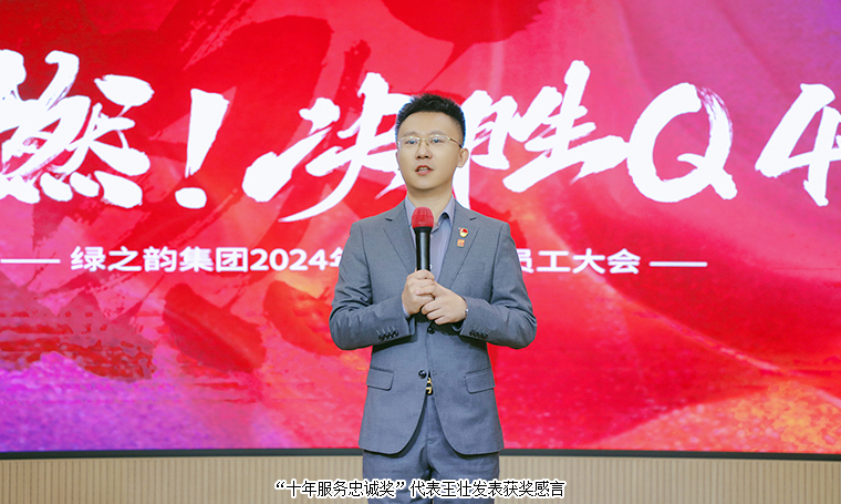 在全場熱烈的掌聲和萬眾矚目中,綠之韻集團胡國安董事長發(fā)表重要講話。他首先代表集團公司向獲得“五年服務英才獎”、“十年服務忠誠獎”、“二十年服務功勛獎”的獲獎員工表示熱烈祝賀,并向全體員工的辛勤付出致以誠摯的謝意。他充分肯定全體綠之韻人在前三個季度的努力工作,號召全體綠之韻人向優(yōu)秀學習,向優(yōu)秀看齊。他強調,五年、十年、二十年受到嘉獎的伙伴都是因為不斷地努力和堅持,才在綠之韻這個舞臺收獲了成長,實現(xiàn)了人生價值,成為了同事們學習的榜樣,也是這份堅持成就了今天的綠之韻。面對空前激烈的市場競爭環(huán)境,我們的市場團隊表現(xiàn)出了強大的團隊凝聚力和拼搏精神,我們也感受到了各市場團隊強大的力量和激情,這份力量鼓舞感染每一個綠之韻人。他希望,全體員工積極宣傳綠之韻的企業(yè)文化,參與到企業(yè)文化的實踐中,深耕對企業(yè)文化的提煉和產品理念的挖掘,全面增強對集團企業(yè)文化的認同感和榮譽感,共同推動企業(yè)的持續(xù)發(fā)展。隨著綠之韻中心的落成啟用,也希望全體員工以嶄新的姿態(tài)和更高的要求面向未來,團結拼搏,奮發(fā)進取,為將綠之韻打造成為社會尊敬、員工幸福、合作者愉快的企業(yè)努力奮斗!