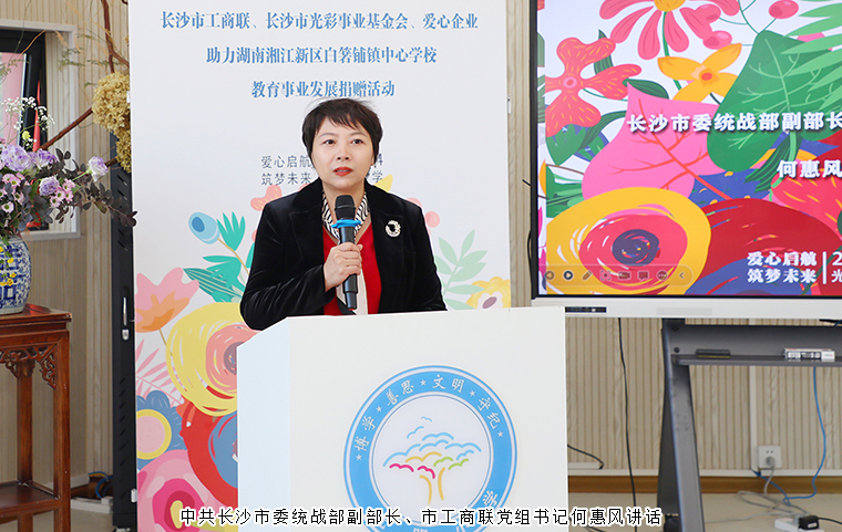 活動最后,中共長沙市委統(tǒng)戰(zhàn)部副部長、市工商聯(lián)黨組書記何惠風(fēng)講話。她向參加此次捐贈活動的企業(yè)家表示衷心感謝。她強調(diào),教育是民族振興、社會進(jìn)步的重要基石,是功在當(dāng)代、利在千秋的德政工程。一直以來,湖南省長沙市光彩事業(yè)基金會和廣大民營企業(yè)家都心系教育、真心幫扶。此次活動,湖南省長沙市光彩事業(yè)基金會的愛心企業(yè)家為學(xué)校送來了智能教學(xué)及基礎(chǔ)教學(xué)設(shè)備,這不僅是物質(zhì)上的關(guān)心與支持,更是精神上的鼓舞與激勵。我們期待發(fā)揮民營企業(yè)的資源優(yōu)勢,推動科技與教育深度鏈接,不斷擴大優(yōu)質(zhì)教育資源的覆蓋面和共享度,努力為學(xué)生鋪開“筑夢之路”、點燃“希望之火”,愿校企攜手合作,共繪多彩教育新畫卷。她表示,愛心助學(xué)只有進(jìn)行時,沒有完成時,需要社會各界長期關(guān)注和持續(xù)努力。希望湖南省長沙市光彩事業(yè)基金會始終秉持“義利兼顧、以義為先,自強不息、止于至善”的光彩精神,廣泛匯聚各方愛心資源,持續(xù)助力教育事業(yè)高質(zhì)量發(fā)展。希望廣大民營企業(yè)家繼續(xù)投身關(guān)心教育、關(guān)愛學(xué)子的民心工程,持續(xù)開展奉獻(xiàn)愛心、凝聚信心的真情善舉。