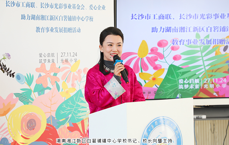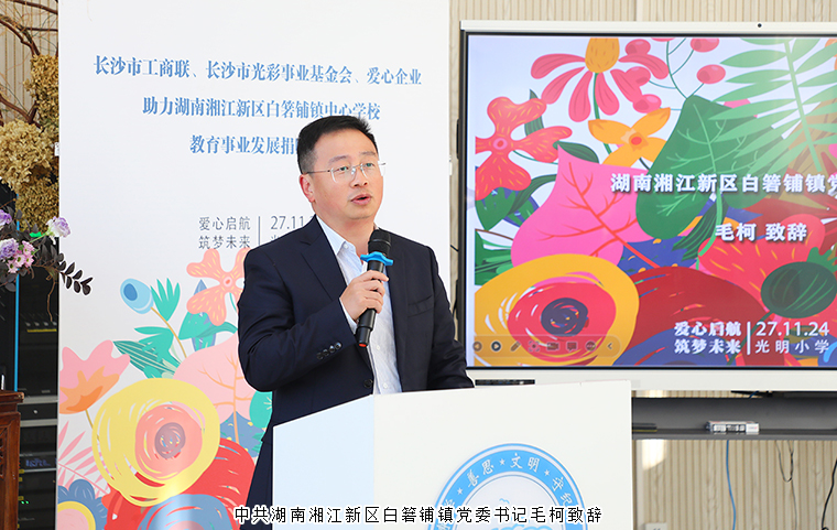 活動由湖南湘江新區(qū)白箬鋪鎮(zhèn)中心學(xué)校書記、校長向慧主持?;顒右潦?,中共湖南湘江新區(qū)白箬鋪鎮(zhèn)黨委書記毛柯致辭。他首先代表白箬鋪鎮(zhèn)向長沙市工商聯(lián)、湖南省長沙市光彩事業(yè)基金會以及各位愛心企業(yè)家的慷慷慨捐贈表示衷心的感謝。這是對白箬鋪鎮(zhèn)教育事業(yè)的極大鼓舞和鞭策,更是對全鎮(zhèn)師生的巨大激勵和鼓舞。希望廣大教育工作者繼續(xù)把教育當(dāng)作最偉大的事業(yè),把講臺當(dāng)做最精彩的舞臺,讓學(xué)生成功、成長、成才,讓自己的人生和事業(yè)更加出彩。衷心期盼各位領(lǐng)導(dǎo)和愛心企業(yè)家一如既往的關(guān)心支持白箬鋪鎮(zhèn)教育事業(yè)的發(fā)展。