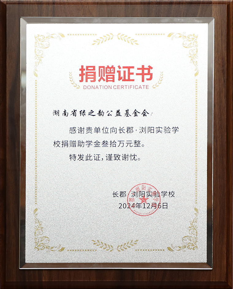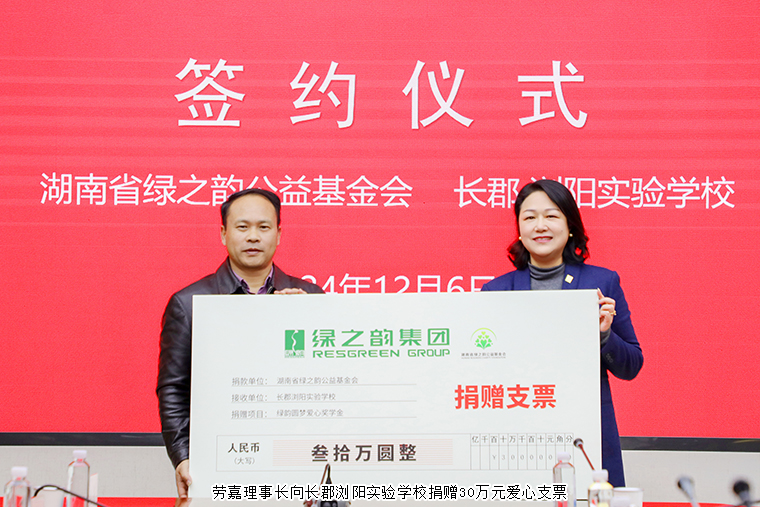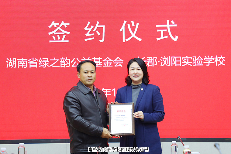 在現(xiàn)場領(lǐng)導(dǎo)嘉賓的見證下,蔣文秘書長代表綠之韻公益基金會(huì)與長郡瀏陽實(shí)驗(yàn)學(xué)校簽訂校企共建協(xié)議,未來3年將陸續(xù)向?qū)W校捐贈(zèng)30萬元專門設(shè)立愛心助學(xué)獎(jiǎng)學(xué)金,重點(diǎn)幫扶在校困難學(xué)生,改善他們的生活和學(xué)習(xí)環(huán)境。隨后,勞嘉理事長向長郡瀏陽實(shí)驗(yàn)學(xué)校捐贈(zèng)愛心支票,肖校長代表學(xué)?;刭?zèng)愛心證書。