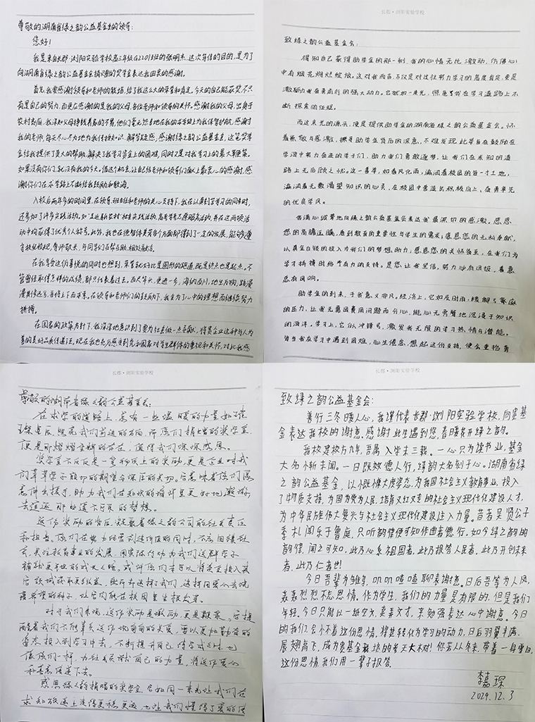 捐贈(zèng)儀式上,肖校長致歡迎辭,他首先對(duì)參加本次捐贈(zèng)儀式的領(lǐng)導(dǎo)和嘉賓表示熱烈歡迎,對(duì)善舉致以誠摯的謝意,匯報(bào)了長郡瀏陽實(shí)驗(yàn)學(xué)校的辦學(xué)理念、管理制度以及取得的成績。他表示,長郡瀏陽實(shí)驗(yàn)學(xué)校是經(jīng)瀏陽市人民政府批準(zhǔn)與長郡中學(xué)合作辦學(xué)的一所12年一貫制公辦學(xué)校,在瀏陽市政府支持下、在長郡中學(xué)的委托管理和引領(lǐng)下取得了比較好的成績,成為瀏陽市辦學(xué)的成功典范,也成為瀏陽教育對(duì)外展示的窗口。感謝園區(qū)領(lǐng)導(dǎo)、園區(qū)企業(yè)的大力支持,才有了今天的成績。此次愛心捐贈(zèng),為學(xué)校解決了后顧之憂,為學(xué)校的困難學(xué)生、優(yōu)秀學(xué)生帶來新的希望,為教育注入溫暖力量。學(xué)生們滿懷感激之情,自發(fā)手寫了多封感謝信,感謝綠之韻集團(tuán)為學(xué)校捐資助教,對(duì)學(xué)子們的大力支持。未來,希望能加強(qiáng)校企聯(lián)合,學(xué)校將推動(dòng)校企資源的深度融合,為企業(yè)輸送更多優(yōu)質(zhì)人才儲(chǔ)備力量,打造更優(yōu)質(zhì)的辦學(xué)典范,為瀏陽教育發(fā)展貢獻(xiàn)力量。