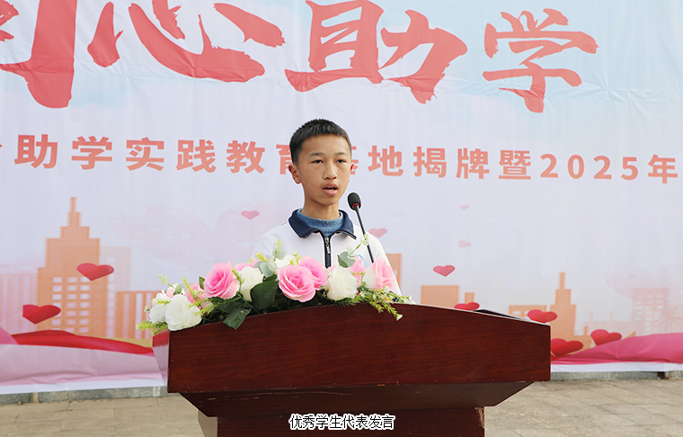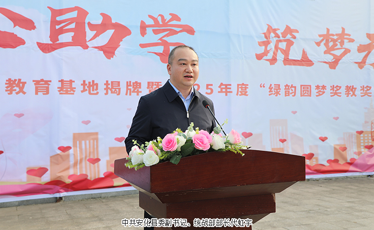中共安化縣委副書記、統(tǒng)戰(zhàn)部部長代虹宇致歡迎辭。他首先對一直大力支持教育事業(yè)的綠之韻集團愛心團隊給予高度贊許。同時表示,2021年,致公黨湖南省委員會與我縣簽訂《助力鄉(xiāng)村振興戰(zhàn)略“致安合作”框架協(xié)議》,通過產(chǎn)業(yè)幫扶、教育助學、醫(yī)療義診等務實舉措,累計投入幫扶資金860萬元,實施項目 23個,為安化鄉(xiāng)村振興注入強勁動能。胡國安董事長設立“綠韻圓夢”獎教獎學金,已經(jīng)連續(xù)三年每年向?qū)W校捐贈人民幣10萬元整,累計惠及師生420人次,彰顯了新時代企業(yè)家的教育情懷和責任擔當。安化大橋?qū)W校作為冷市鎮(zhèn)教育的窗口,近年來在各方支持下,辦學條件顯著改善,教學質(zhì)量穩(wěn)步提升。今天實踐教育基地揭牌,既是總結(jié)更是啟航。期盼學校深化合作,在課程共建、師資培育等方面創(chuàng)新突破,打造鄉(xiāng)村教育振興示范樣本。希望同學們立鴻鵠志、做追夢人,將感恩之心轉(zhuǎn)化為“強國有我”的奮斗力量,讓青春在傳遞愛心中綻放光彩。讓我們以此次活動為新起點,凝聚各方力量,厚植教育情懷,持續(xù)推動城鄉(xiāng)教育優(yōu)質(zhì)均衡發(fā)展,為鄉(xiāng)村振興培育更多生力軍。