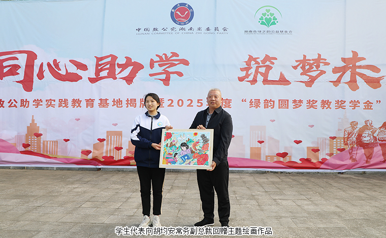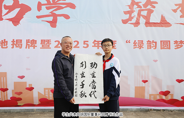 在全場領導嘉賓的見證下,湖南省人大常委會副主任、致公黨省委會主委胡旭晟,中共安化縣委副書記、統(tǒng)戰(zhàn)部部長代虹宇,冷市鎮(zhèn)中心學校校長張亮,綠之韻集團董事長胡國安共同為“致公助學實踐教育基地”揭牌,標志著安化大橋?qū)W校成為致公黨湖南省委會與綠之韻公益基金會教育幫扶的重要基地,助力安化縣實施鄉(xiāng)村振興文化振興、教育振興。學生代表向胡國安董事長、胡均安常務副總裁回贈了精心創(chuàng)作的書法及主題繪畫作品,筆觸間飽含感恩與感激之情。