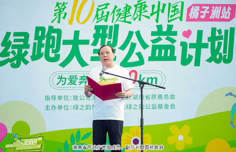 湖南省民政廳黨組成員、副廳長廖國核致辭。他表示,今天,我們相聚在橘子洲,參與第10屆綠之韻“健康中國-綠跑大型公益活動,共同見證湖南省綠之韻公益基金會成立10周年。他代表湖南省民政廳、湖南省慈善總會,向每一位心懷赤誠的參賽選手致以問候,向深耕公益的綠之韻集團(tuán)表示誠摯感謝,向所有為湖湘慈善事業(yè)添磚加瓦的仁人志士致以崇高的敬意。公益是精神圖騰,慈善是心靈長跑。他表示,10年來,綠跑從松雅湖到湘江,從企業(yè)善意到30萬群眾參與,每一步都刷新公益溫度,丈量文明高度。綠之韻集團(tuán)22年堅(jiān)持將公益融入企業(yè)血脈,在扶危濟(jì)困等領(lǐng)域播撒希望。綠跑活動10年捐贈款物近3000萬元,吸引3萬人參與,輻射超30萬人次。湖南省綠之韻公益基金會10年來組織了400多場公益活動,捐贈款物9100多萬,彰顯了企業(yè)擔(dān)當(dāng),詮釋了湖湘精神。