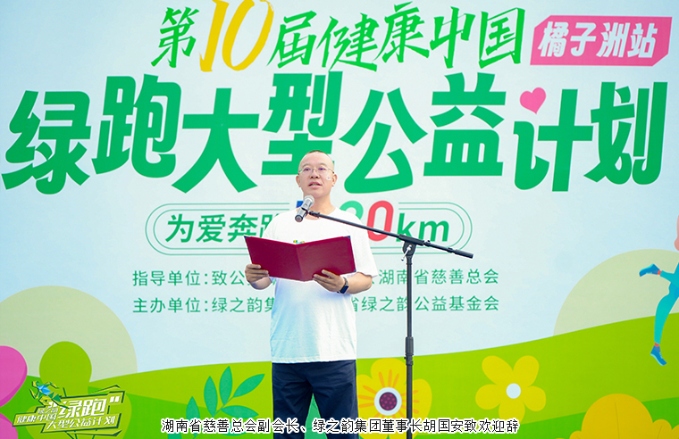 湖南省慈善總會副會長、綠之韻集團(tuán)董事長胡國安致歡迎辭。他首先代表綠之韻集團(tuán)及公益基金會,向蒞臨本次活動的領(lǐng)導(dǎo)嘉賓、媒體朋友、跑步愛好者,以及來自全國各地的家人們致以最熱烈的歡迎;向10年來風(fēng)雨同路的5.20公里踐行者,向所有投身公益的愛心企業(yè)、市民朋友,致以崇高的敬意和誠摯的感謝。他表示,今年公益綠跑的主題是“10放活力 益起上場”?!?0”既是綠跑舉辦10屆的里程碑,更是綠之韻公益基金會成立10周年的見證。2023年,綠之韻投入1000萬元啟動了“圓夢行動”公益項(xiàng)目。本屆綠跑,我們將繼續(xù)推進(jìn)“圓夢行動”公益項(xiàng)目,與湖南省慈善總會、芒果TV芒果公益平臺、長沙市彩虹殘疾人士服務(wù)中心、瀏陽市、安化縣等地多個(gè)單位簽訂圓夢結(jié)對幫扶協(xié)議,去幫助更多需要幫助的人。他祝愿,每一位綠跑選手都能取得好成績,愿今天的湘江碧波見證更多公益火種的播撒,愿我們攜手邁向更加健康、美好的明天!