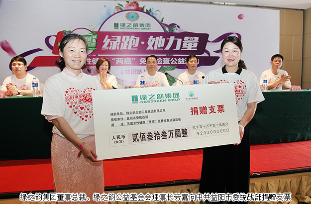 活動現(xiàn)場,綠之韻集團董事總裁、綠之韻公益基金會理事長勞嘉向益陽市委統(tǒng)戰(zhàn)部捐贈233萬元支票。這筆愛心捐款將用于益陽市10000名城鎮(zhèn)低保常住女性進行“兩癌”免費公益檢查。勞嘉總裁在講話中表示,綠之韻集團創(chuàng)立十五年以來,始終秉持“關愛生命,造福人類”的公益理念,在發(fā)展實業(yè)的同時,積極承擔社會責任,產(chǎn)業(yè)富民,回饋社會,踴躍參與和傾情捐助了100多項社會公益項目,累計捐贈款物達6700多萬元。一直以來,綠之韻集團高度重視婦女事業(yè)的發(fā)展,把守護女性健康作為企業(yè)從事大健康產(chǎn)業(yè)的一個重要努力方向。此次“綠跑·她力量 關愛女性健康——‘兩癌’免費公益檢查活動”,除了為益陽10000名貧困適齡婦女免費提供“兩癌”檢查服務,還將甄選一些特別貧困的“兩癌”患病家庭施以援手,進行精準幫扶。綠跑,是綠之韻集團將“健康跑”和“主題公益”相融合一個大型公益計劃,截至目前已經(jīng)在湖南瀏陽、湘西吉首、長沙松雅湖成功舉辦了三屆。今年6月,綠之韻集團將繼續(xù)以“健康跑”的方式,凝聚社會各界愛心力量,廣泛關注貧困“兩癌”家庭,在宣傳“兩癌”科普知識的同時,倡導國民在日常生活中保持健康積極的生活狀態(tài)。