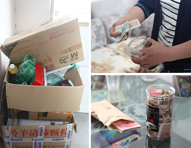 郭秀君說,自從三年前母親病逝之后,為了照料孩子們的生活和學習,也因為自身的病情,很多工作都做不了,沒有固定收入,生活極為困難。社區(qū)曾給她安排了環(huán)衛(wèi)工人的工作,剛開始掃大街她就被車撞過一次,現(xiàn)在手上還留有傷痕,但她始終想堅持,有份工作不容易。環(huán)衛(wèi)工作風里來雨里去,她極容易患病發(fā)燒,后來實在沒辦法繼續(xù),只能外出時撿撿廢品貼補家用。她拿出一個塑料瓶給我們看,里面有一毛、五毛、一塊的零錢,加起來也不過幾十塊錢。那是她平時撿廢品賣的錢,每當孩子想要買零食吃的時候,她都會拿出瓶子告訴他們,這是家里所有的錢了。孩子們便默不作聲了。盡管說得平靜,我們還是看出了她隱忍的淚。雖然是租住的房子,但是家里處處可見這個媽媽的用心,可愛的卡通儲蓄罐、粘貼在墻上的孩子們的學習獎狀、女兒1.5的小床上還有個一人高的卡通玩偶。郭秀君說,這是女兒最愛的玩偶,也是別人不要了送過來的。