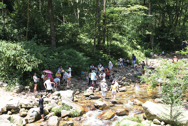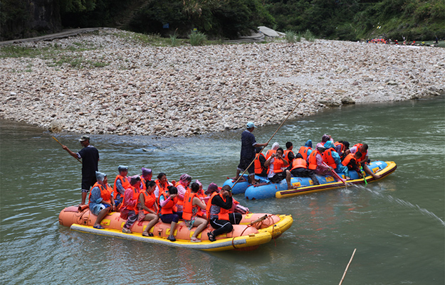 炎炎夏日,伙伴們對水的渴望更加強烈。張家界旅行的重頭戲便是前往素有“天下第一漂”美譽的猛洞河漂流,感受與水搏斗的激情和清涼。從“哈妮宮”出發(fā),順?biāo)拢蝗~扁舟,在原始次生林的高山峽谷之中,綠之韻營銷精英們身著救身衣、乘皮舟、闖險灘、博激流,沿途觀美景、沐瀑流、打水仗、過峽關(guān),出沒浪端谷底,激情高漲之時,忍不住放歌長嘯,戲水嘻鬧,找回快樂童真的自我。
