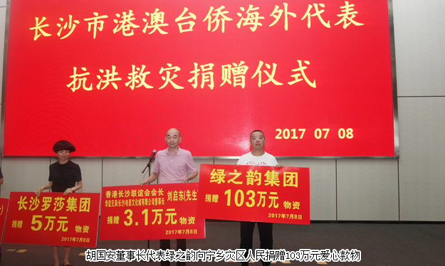 2017年7月8日,心連心、共命運(yùn)——長(zhǎng)沙市港澳臺(tái)僑海外代表抗洪救災(zāi)捐贈(zèng)活動(dòng)在寧鄉(xiāng)舉行,中共長(zhǎng)沙市委常委、統(tǒng)戰(zhàn)部部長(zhǎng)譚小平,長(zhǎng)沙市政協(xié)黨組織副書記、副主席石長(zhǎng)松,中共長(zhǎng)沙市委統(tǒng)戰(zhàn)部常務(wù)副部長(zhǎng)劉映群,中共長(zhǎng)沙市委統(tǒng)戰(zhàn)部副部長(zhǎng)、市僑聯(lián)黨組書記王國(guó)平,中共長(zhǎng)沙市委統(tǒng)戰(zhàn)部副部長(zhǎng)、市臺(tái)辦主任袁義和等領(lǐng)導(dǎo)出席活動(dòng)。湖南省政協(xié)委員、香港湘都同鄉(xiāng)會(huì)名譽(yù)會(huì)長(zhǎng)、長(zhǎng)沙市海外聯(lián)誼會(huì)副會(huì)長(zhǎng)、綠之韻集團(tuán)董事長(zhǎng)胡國(guó)安,長(zhǎng)沙市政協(xié)常委、香港長(zhǎng)沙聯(lián)誼會(huì)執(zhí)行會(huì)長(zhǎng)、善德集團(tuán)董事長(zhǎng)張曉琴,湖南省綠之韻公益基金會(huì)秘書長(zhǎng)蔣文、副會(huì)長(zhǎng)胡武安等與數(shù)十名長(zhǎng)沙市港澳臺(tái)僑海外代表企業(yè)家共同參與活動(dòng),并通過牽頭募捐和以身作則,共籌集619余萬(wàn)愛心款物深入寧鄉(xiāng)重災(zāi)區(qū),希望幫助受災(zāi)群眾早日重建家園、恢復(fù)正常生活秩序。