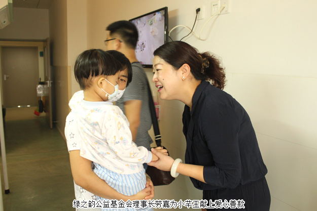 在得知了“小芊玉”的情況之后,綠之韻公益基金會理事長勞嘉親赴醫(yī)院探望,并將愛心善款送到小芊玉父母手中,并表示,綠之韻集團將會持續(xù)關(guān)注“小芊玉”的治療情況,她也呼吁更多的愛心人士伸出援手,幫助“小芊玉”早日戰(zhàn)勝病魔,快樂健康地長大。在愛的接力下,小芊玉即將赴北京接受骨髓配型。關(guān)愛生命,綠之韻與愛同在!