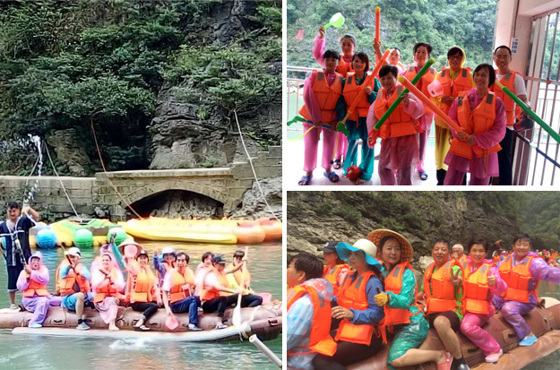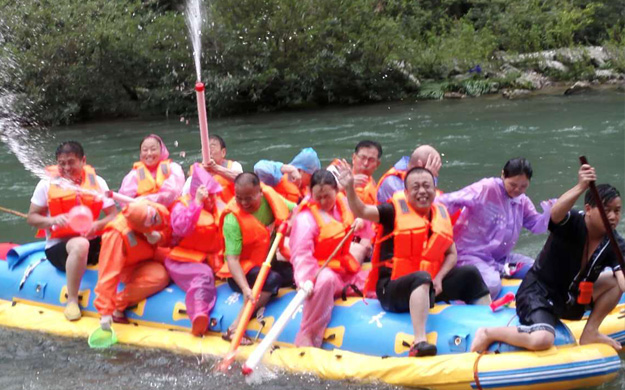 第二站,綠之韻的家人們前往素有“天下第一漂”美譽的猛洞河漂流,感受與水搏斗的激情和清涼。水槍、水瓢、雨衣等打水仗的“武器”裝備齊全,只見河中水花飛舞、水柱橫飛,還未坐上船伙伴們就紛紛“濕身”了。拐一百五十五個彎,在一百三十三個灘潭中穿梭而行,途徑三角巖、雞籠門、落水坑瀑布、夢思峽……綠之韻家人順流而下,在這里放歌長嘯,戲水嘻鬧,找回快樂的自我。