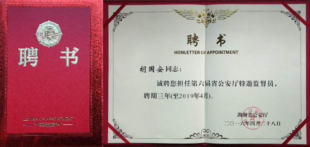 談到再次受聘為湖南省公安廳特邀監(jiān)督員,胡國(guó)安董事長(zhǎng)表示: 2008年,我首次受聘為湖南省地方稅務(wù)特邀監(jiān)察員,2012年被受聘為湖南省紀(jì)委、省監(jiān)察廳“機(jī)關(guān)效能建設(shè)和優(yōu)化經(jīng)濟(jì)發(fā)展環(huán)境監(jiān)督測(cè)評(píng)員”,2013年又被受聘為“湖南省公安廳第五屆特邀監(jiān)督員”,對(duì)特邀監(jiān)督員這個(gè)身份始終葆有一種神圣的使命感和責(zé)任感。這個(gè)聘書是沉甸甸的,跟人大代表、政協(xié)委員的身份一樣,不僅是一種光榮,更肩負(fù)著廣大普通民眾的矚托。我一定不辜負(fù)省公安廳黨委的期望,不辜負(fù)廣大民眾的重托,爭(zhēng)做稱職的、優(yōu)秀的監(jiān)督員,并充分發(fā)揮好監(jiān)督、橋梁和參謀作用,為我省公安工作和隊(duì)伍建設(shè)做出自己更大的貢獻(xiàn)。