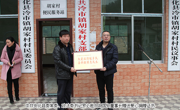 愛心慰問活動(dòng)上,安化縣政協(xié)主席李太源發(fā)表講話,對胡國安董事長致富思源、支援家鄉(xiāng)建設(shè)的高尚情操,對綠之韻集團(tuán)精準(zhǔn)扶貧、回報(bào)桑梓的大愛情懷表示高度的肯定和贊許;安化縣冷市鎮(zhèn)胡家村村支書胡利民簡單介紹了胡家村相關(guān)情況。湖南省慈善總會(huì)副會(huì)長、綠之韻集團(tuán)董事長胡國安代表湖南省慈善總會(huì)向安化縣慈善會(huì)捐贈(zèng)10萬元款物支票,中共安化縣委常委、政法委書記羅必勝向胡國安董事長頒發(fā)了愛心捐贈(zèng)證書。儀式上,湖南省慈善總會(huì)副會(huì)長、綠之韻集團(tuán)董事長胡國安發(fā)表了飽含真情的講話。他在發(fā)言中表示,“一個(gè)企業(yè)能夠受到政府的關(guān)心、贏得社會(huì)的信賴,獲得民眾的尊重,一定離不開對社會(huì)責(zé)任的思考、實(shí)踐和擔(dān)當(dāng)。安化胡家村是我的家鄉(xiāng),生我養(yǎng)我的熱土,生命之源,難忘之根。沒有胡家村,就沒有我,沒有綠之韻。我從這里的大山走出去,也想幫助更多人走出大山,過上幸??鞓返纳?。綠之韻公益基金會(huì)除了繼續(xù)幫扶家鄉(xiāng)建設(shè)水、電、道路和學(xué)校等基礎(chǔ)設(shè)施,還將進(jìn)一步推動(dòng)輸血式扶貧向造血式、“互聯(lián)網(wǎng)+三農(nóng)”扶貧模式轉(zhuǎn)變,盡最大努力幫助解決安化扶貧的實(shí)際困難,幫助家鄉(xiāng)困難群眾建立脫貧希望,尋找致富方法,使企業(yè)發(fā)展成果惠及更多鄰里鄉(xiāng)親們!”