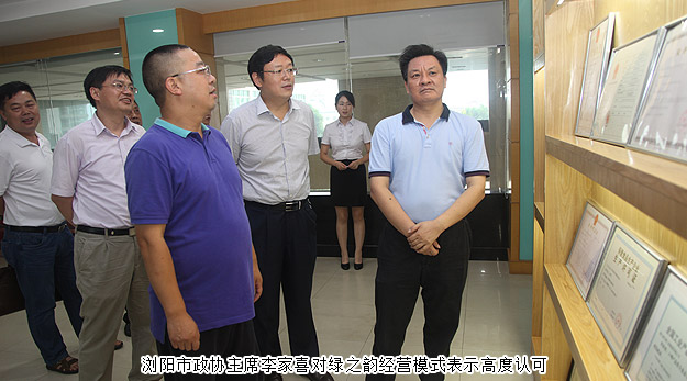 2015年8月18日,瀏陽市政協(xié)主席李家喜、瀏陽市政協(xié)副主席郭榮華、瀏陽市政協(xié)秘書長許百經(jīng),瀏陽市發(fā)展和改革局黨組副書記、副局長龍春湘,瀏陽市工業(yè)和信息化局副局長林德懿,瀏陽市工商聯(lián)副主席黃萍,瀏陽經(jīng)濟開發(fā)區(qū)辦公室主任彭衛(wèi)新等一行蒞臨綠之韻集團考察指導(dǎo)。湖南省政協(xié)委員、綠之韻集團董事長胡國安,瀏陽市政協(xié)常委、綠之韻集團董事常務(wù)副總裁勞嘉,綠之韻集團黨總支部書記許達仲,綠之韻集團辦公室主任馮紅等陪同考察。