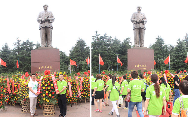 第三站,綠之韻的伙伴們來(lái)到了毛澤東銅像廣場(chǎng),瞻仰偉大的毛主席。毛主席銅像立于高高的紅色花崗巖石基座上,背靠韶峰,主席身軀偉岸,手握書(shū)卷,雙眼炯炯有神,面帶微笑地注視著廣場(chǎng),注視著遠(yuǎn)方,仿佛在歡迎遠(yuǎn)來(lái)的客人和世界各地的朋友,主席又似乎停步思考著天下的大事,一派學(xué)者風(fēng)范。廣場(chǎng)上人山人海,來(lái)自祖國(guó)各地、五湖四海的人們不約而同匯聚在偉人腳下。各色花籃,虔誠(chéng)鞠躬,深情仰望,每個(gè)人都自發(fā)自覺(jué)的用自己的方式懷念著這位偉大的無(wú)產(chǎn)階級(jí)革命家,壯志成城的政治家,永垂不朽的理論家。綠之韻集團(tuán)全球營(yíng)銷(xiāo)中心(中國(guó)區(qū))副總經(jīng)理、國(guó)際商學(xué)院執(zhí)行院長(zhǎng)孫心琥,帶領(lǐng)營(yíng)銷(xiāo)精英們整齊有序排好隊(duì)列,懷著無(wú)比敬仰與懷念,給毛澤東銅像敬獻(xiàn)了美麗的花籃,并恭敬地給毛澤東銅像三鞠躬,然后緩緩地從左往右圍繞毛澤東銅像走了一周,以表達(dá)我們對(duì)一代偉人的深深摯情。