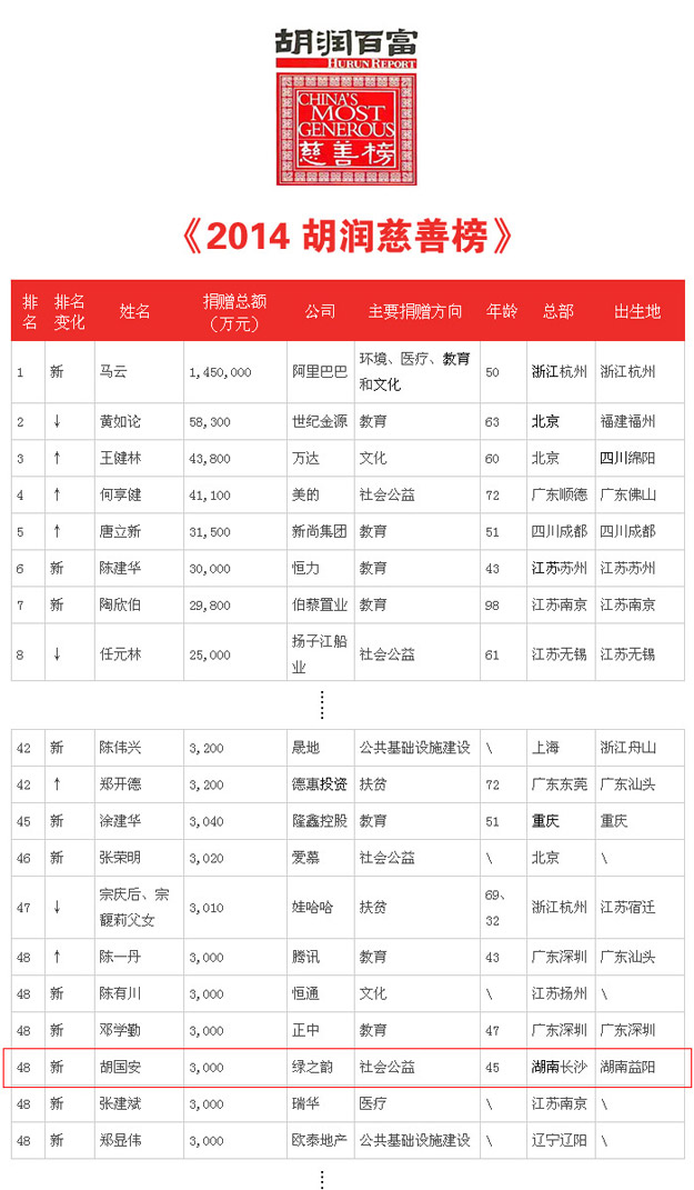 胡國(guó)安董事長(zhǎng)榮登2014胡潤(rùn)慈善榜,綠之韻公益慈善事業(yè)備受關(guān)注