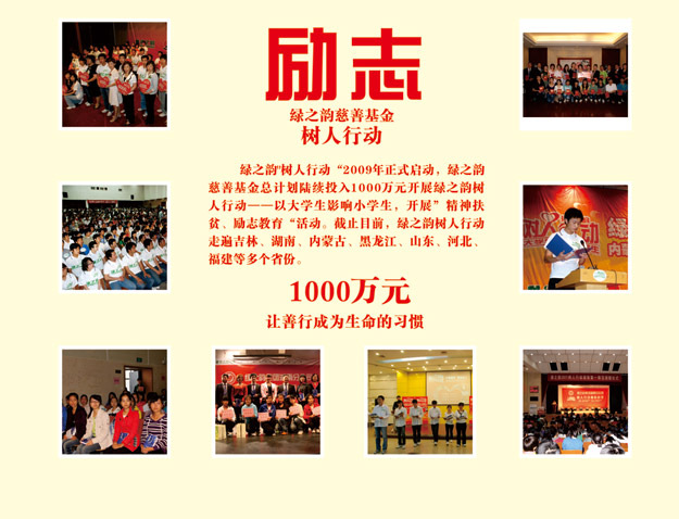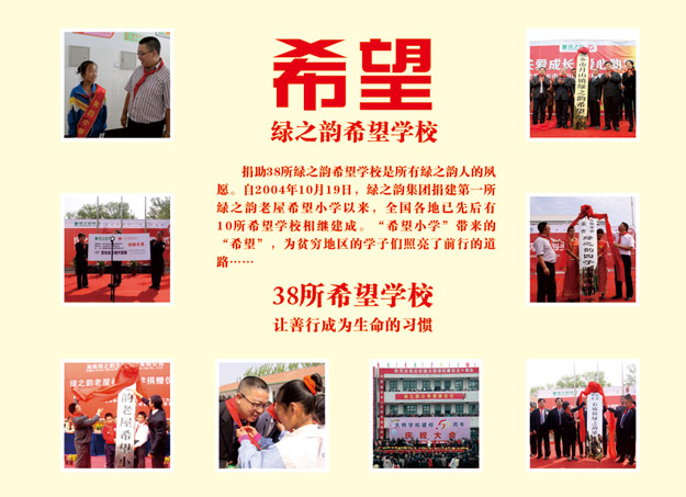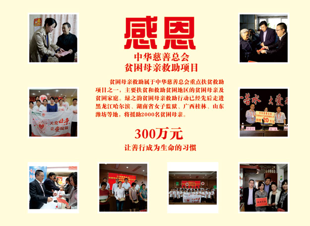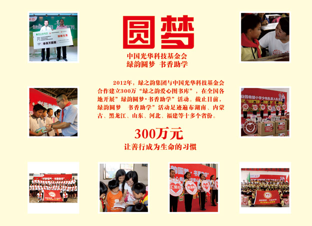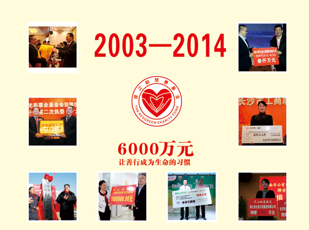 今年是胡潤(rùn)慈善榜十周年,同時(shí)也是綠之韻集團(tuán)成立的第十一個(gè)年頭。十一年來(lái),綠之韻集團(tuán)在胡國(guó)安董事長(zhǎng)帶領(lǐng)下,踴躍參與和傾情捐助了教育、關(guān)愛(ài)老人、賑災(zāi)、扶貧、幫困等多項(xiàng)社會(huì)慈善事業(yè),用實(shí)際行動(dòng)履行著企業(yè)應(yīng)盡的責(zé)任和義務(wù),如:在全國(guó)各地先后援建了10所希望小學(xué)、陸續(xù)投入1000萬(wàn)元開(kāi)展“樹(shù)人行動(dòng)”、投入300萬(wàn)元在全國(guó)各地開(kāi)展“綠韻圓夢(mèng)?書(shū)香助學(xué)”活動(dòng)、向湖南省光彩事業(yè)基金捐贈(zèng)3000萬(wàn)元促進(jìn)“老、少、邊、窮”地區(qū)的經(jīng)濟(jì)發(fā)展和社會(huì)進(jìn)步、捐資300萬(wàn)專項(xiàng)扶貧基金開(kāi)展“關(guān)愛(ài)貧困母親”行動(dòng)。截止目前,綠之韻集團(tuán)已累計(jì)捐贈(zèng)款物達(dá)6000多萬(wàn)元,贏得了社會(huì)各界的廣泛關(guān)注和好評(píng)。2014年9月23日,中華慈善總會(huì)成立20周年紀(jì)念會(huì)在北京舉行,綠之韻集團(tuán)被光榮授予“中國(guó)慈善突出貢獻(xiàn)獎(jiǎng)“。