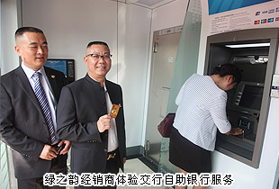 揭幕儀式后,綠之韻經(jīng)銷商代表張建軍、黃翔、沈慧芳等親身體驗了交行自助銀行服務(wù);參與本次活動的經(jīng)銷商、市民現(xiàn)場咨詢、辦理了相關(guān)銀行業(yè)務(wù)。