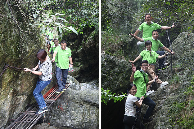 悠悠蒼穹,思接千載。在安化縣的崇山峻嶺和山澗溪流之間,綿延著一條神秘的茶馬古道。千百年來,無數(shù)的馬幫在這條道路上默默行走,悠遠的馬鈴聲,回蕩在山谷、急流和村寨上空,開辟了一條通往域外的經(jīng)貿之路,形成了世界上地勢最高、山路最險、距離最遙遠的茶馬文明古道。在關山峽谷層巖疊翠,怪石嶙峋的道路上行走,綠之韻伙伴們盡情體驗了一番攀巖探險的刺激和樂趣。正是因為古道的艱險超乎尋常,沿途壯麗的自然景觀也不斷地激發(fā)人潛在的勇氣、力量和忍耐?!安桉R古道馬幫所經(jīng)歷的冒險性是人所共稱道的,他們身上最為突出的特征就是他們的冒險精神。為了生存,為了貿易獲利,馬幫們幾乎是以自己的生命去冒險。這種冒險體現(xiàn)在三個方面:一是生意上的冒險,二是面對嚴峻的大自然的冒險,三是土匪強盜的威脅。馬幫的這種冒險精神,值得我們每一個綠之韻人深思和學習!”綠之韻總裁助理方彥雄在尋蹤茶馬古道途中感慨萬千。