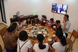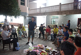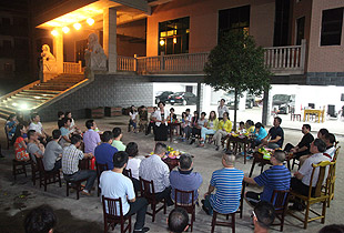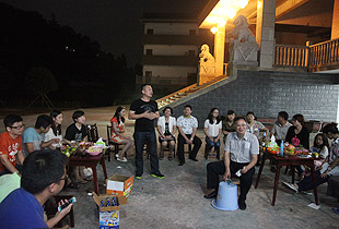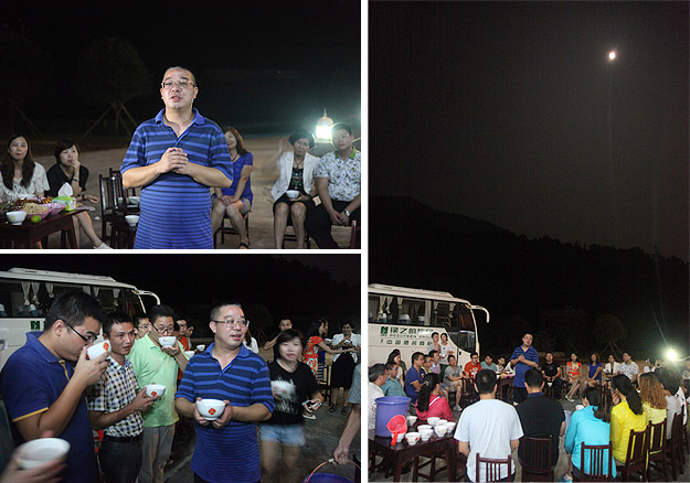 中秋圓月當空照,綠韻山莊話家常。吃完晚餐,大家圍坐在寬敞的前坪,一場中秋月圓之夜的茶話會激情上演。大家暢所欲言地交流,伙伴們精心編排的“小蘋果”激情舞動,氛圍無比融洽。中醫(yī)養(yǎng)生專家、湖南中醫(yī)藥大學李定文教授為大家?guī)砹恕安枧c人生”、“茶與健康”的精彩講演;公司常年法律顧問尹湘南律師根據(jù)自己兩天來的親身體驗,暢談了心中所想、所思、所悟。隨后,大家開始玩起了“擊鼓傳花”的游戲,誰接到鼓聲停止的那一棒就即興表演節(jié)目,有的清唱山歌,有點翩翩起舞,有的講起笑話,有的表演小品,其樂融融,親如一家。茶話會上,胡國安董事長深情滿懷地說:“我家門前的小九溪,從著名的雪峰山深處走來,拐個彎又不知疲倦地往外面的世界奔去。沿著這條小溪,我走過了童年、少年,明白了在群山之間蜿蜒奔流的小九溪的夢想,明白了小九溪晝夜不舍奔向浩瀚汪洋的意義。我想,一個人、一支團隊或者一個企業(yè),如果能夠像小九溪一樣,堅韌執(zhí)著于夢想,不畏萬難咬目標,何愁不能成長、發(fā)展,乃至基業(yè)長青呢?這一次邀請優(yōu)秀黨員、員工來到我的家鄉(xiāng)做客,就是想讓大家深刻領悟‘水的精神’、‘家文化’的根本,切身明白‘綠之韻水的精神和家文化’存在于諸位人生、綠之韻發(fā)展中的重要意義。”