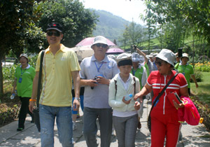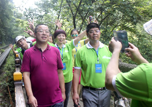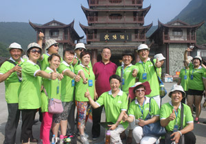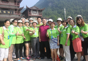 第二天,最讓伙伴們感動(dòng)的是:伙伴們正準(zhǔn)備挺進(jìn)武陵源景區(qū)大門(mén)時(shí),突然見(jiàn)到尊敬的胡國(guó)安董事長(zhǎng)頂著炎炎烈日、大汗淋漓、在百忙之中走到我們中間,與所有伙伴一起游覽十里畫(huà)廊,并一一合影留念。胡董事長(zhǎng)說(shuō):“爬山好比我們綠之韻事業(yè),開(kāi)始會(huì)有很多的憧憬、愿望、懷疑、憂慮,當(dāng)我們一步一個(gè)腳印前進(jìn)時(shí),發(fā)現(xiàn)在前行的過(guò)程中有很多美麗的風(fēng)景、可愛(ài)的伙伴,但是,也會(huì)遇到恐懼、坎坷。在這過(guò)程中,有鼓勵(lì)你的人、也有打擊的人,關(guān)鍵是自己的毅力與耐力是否能戰(zhàn)勝自己。不管怎樣,我愿意陪伴大家一起走向成功的頂峰?!焙麻L(zhǎng)真是太神奇了,他之前的一番話,伙伴們?cè)谂郎竭^(guò)程中幾乎全部遇到了。當(dāng)伙伴們爬過(guò)一個(gè)小山丘時(shí),有人開(kāi)心的不得了,尤其是站在山腰往下看到美麗的山與大樹(shù)時(shí)更是欣喜若狂。大家鼓足勇氣,一鼓作氣爬到了頂峰,每個(gè)人的臉上都露出了勝利與幸福的笑容!