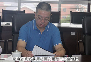 據(jù)了解,湖南省優(yōu)秀政協(xié)委員、綠之韻集團董事長胡國安于2014年5月7日正式當選省政協(xié)派駐省工商行政管理局(首批聘用)民主監(jiān)督員后,先后參與“應(yīng)邀參加派駐單位的有關(guān)會議和活動,對派駐單位相關(guān)工作開展視察、調(diào)研和走訪,收集、了解和反映社情民意,監(jiān)督省政協(xié)建議案、提案的辦理落實情況”等一系列活動,為湖南省工商局各項工作的推進提出了合理化意見和建議。同時,作為監(jiān)督員,胡國安委員倍感責任重大。他表示,成為民主監(jiān)督員,是身為政協(xié)委員的我知情、問政、獻智、出力的重要途徑,我將努力把民主監(jiān)督由“軟”變“硬”,由“虛”變“實”,由“被動”變“主動”,成為推進民主監(jiān)督組織化、具體化,推動政協(xié)履行職能制度化、規(guī)范化、程序化的重要形式和有效載體。使命光榮,責任壓肩,一定不會辜負黨和人民的重托和期許,不斷加強自身學(xué)習(xí),多聯(lián)系、多交流、多溝通,遵循“懂行、明責、知情”六字訣,快速進入角色,努力做組織放心、派駐單位歡迎,人民群眾滿意的監(jiān)督員。