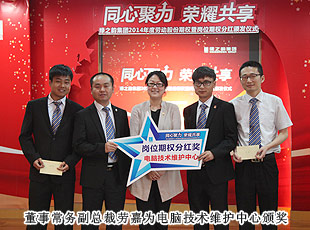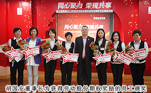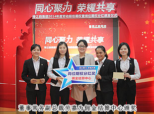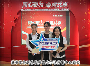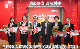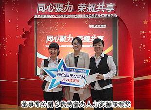 通過學(xué)習(xí)和借鑒,適時引入“勞動股份期權(quán)”這一前瞻性概念,并付諸于一諾千金的主動性企業(yè)行為,是綠之韻在其發(fā)展過程中區(qū)別于其他企業(yè)的顯著標志,也是本次頒獎大會上最重大的亮點。“綠之韻模式”的勞動股份期權(quán)獎勵機制,始于2011年,分為勞動股份期權(quán)(三年期)和勞動股份期權(quán)(五年期)兩種形式,兌付方式分為一次性兌付和逐年兌付兩種方式,開創(chuàng)了直銷企業(yè)主動將企業(yè)價值與普通員工共享的里程碑式先河。在全場熱烈的掌聲中,胡國安董事長親自為獲得2014年勞動股份期權(quán)獎勵的員工頒發(fā)了獎勵,并逐一合影留念。