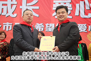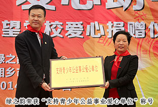 揭牌儀式上,月山鎮(zhèn)學校的學生們向出席儀式的綠之韻集團愛心人士敬獻了紅領巾。全球營銷中心(中國區(qū))副總經(jīng)理劉維利代表綠之韻慈善基金遞交30萬元愛心捐贈支票,長沙市青基會理事長羊舒麟接受捐贈,并授予綠之韻“支持青少年公益事業(yè)愛心單位”牌匾。共青團湘潭市委書記白云峰與綠之韻集團胡國安董事長共同為希望學校揭牌,并向胡國安董事長頒發(fā)了愛心企業(yè)家榮譽牌匾,各級領導嘉賓與愛心經(jīng)銷商代表全程見證。